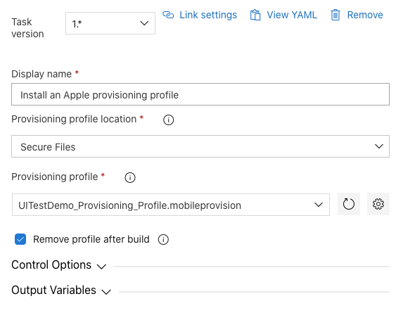 In the Signing & Provisioning in Provisioning profile UUID enter $(APPLE_PROV_PROFILE_UUID). This variable is automatically set by the Install Apple Provisioning Profile task for the provisioning profile you selected.